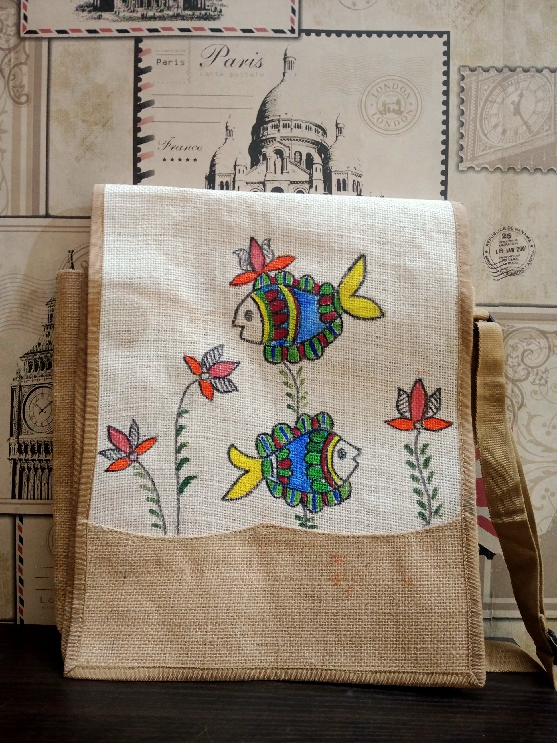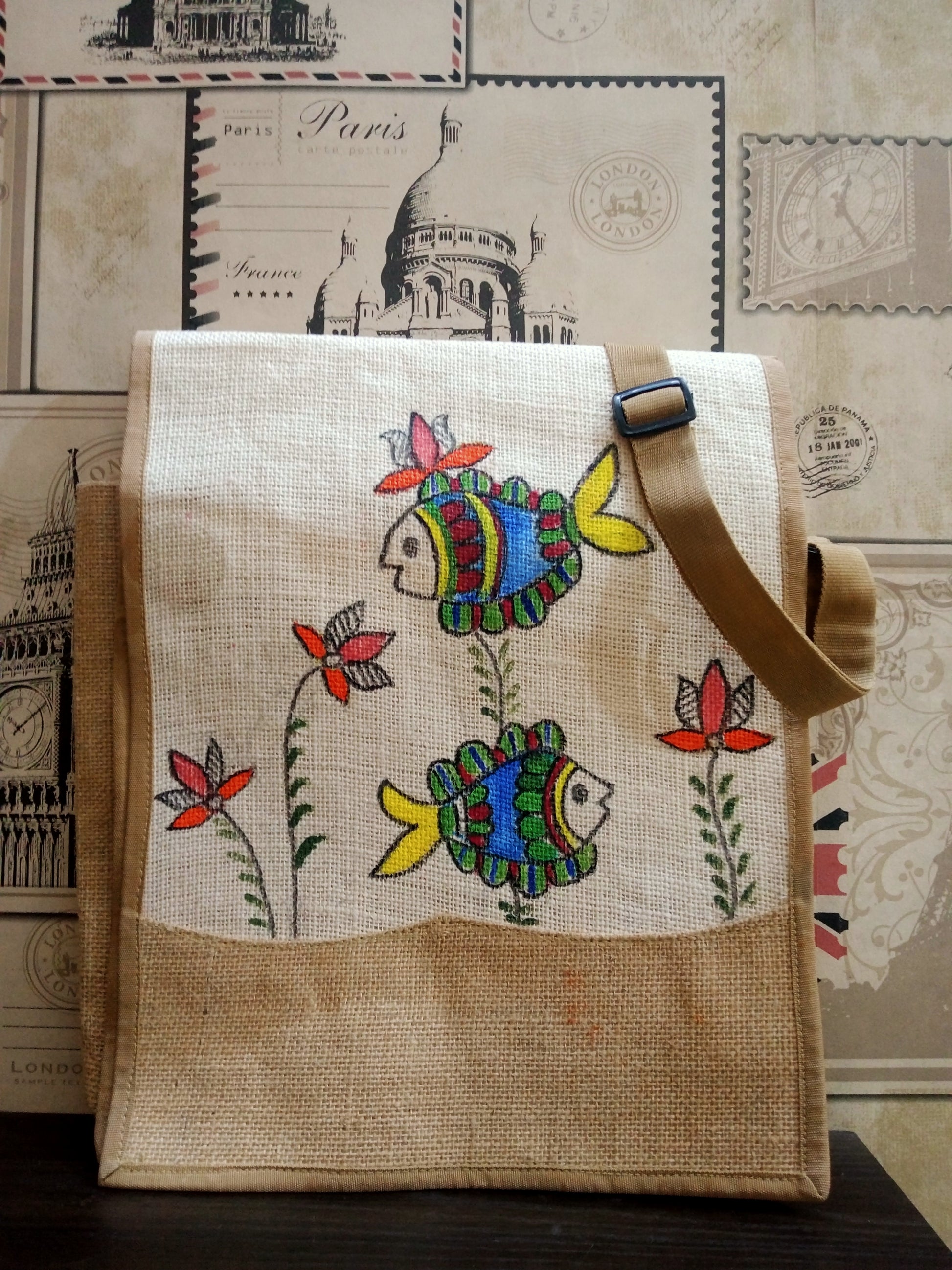 "Folk Fins" – Hand-Painted Fish Motif Jute Side Bag